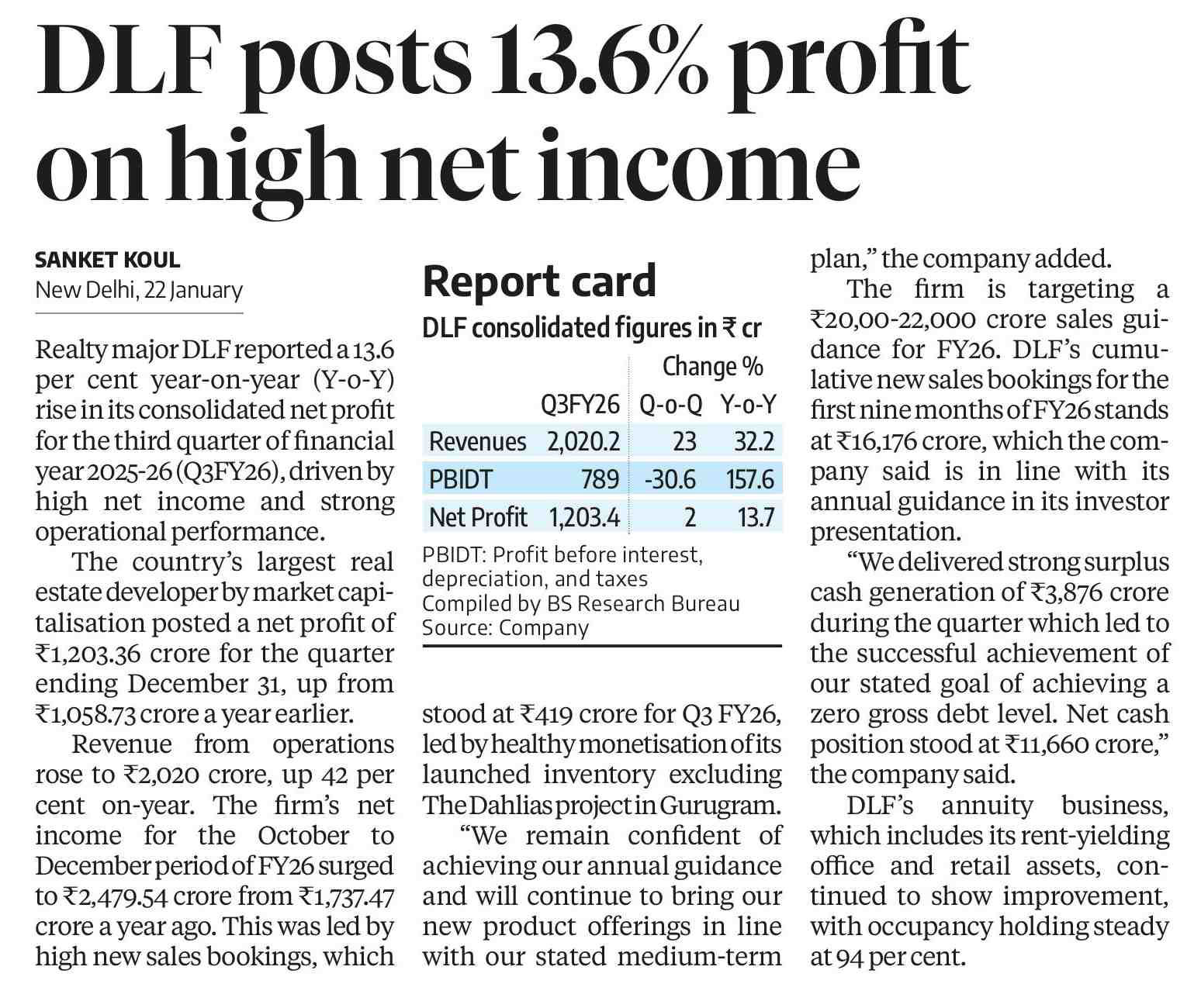 Realty major DLF reported a 13.6 per cent year-on-year (Y-o-Y) rise in its consolidated net profit for the third quarter of financial year 2025-26 (Q3FY26), driven by high net income and strong operational performance.