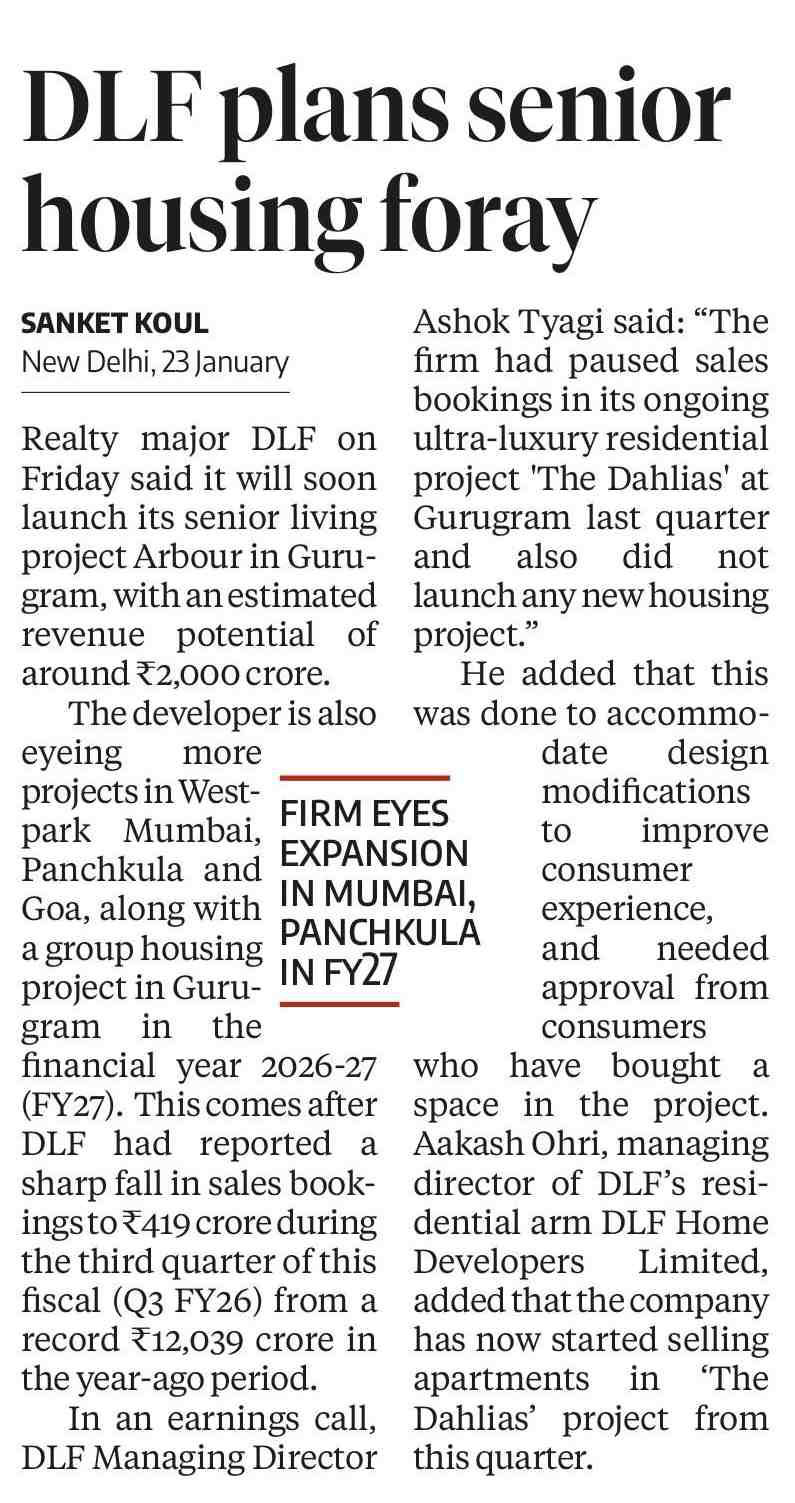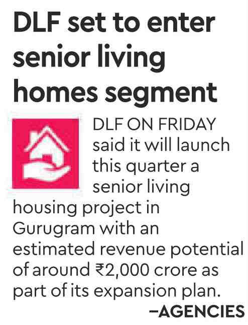 DLF ON FRIDAY said it will launch this quarter a senior living housing project in Gurugram with an estimated revenue potential of around Rs. 2,000 crore as part of its expansion plan.