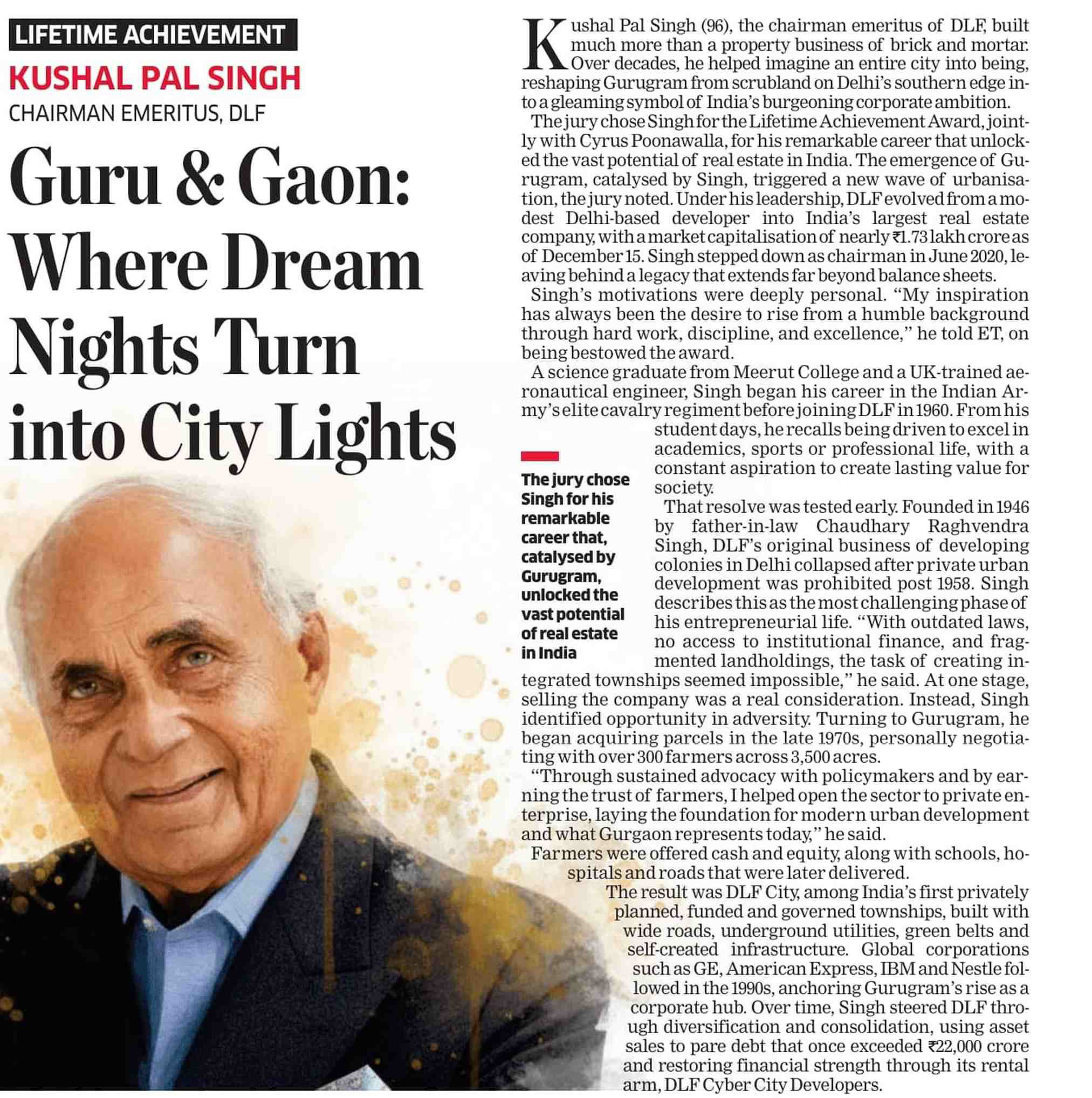 Kushal Pal Singh (96), the chairman emeritus of DLF, built much more than a property business of brick and mortar. Over decades, he helped imagine an entire city into being, reshaping Gurugram from scrubland on Delhi's southern