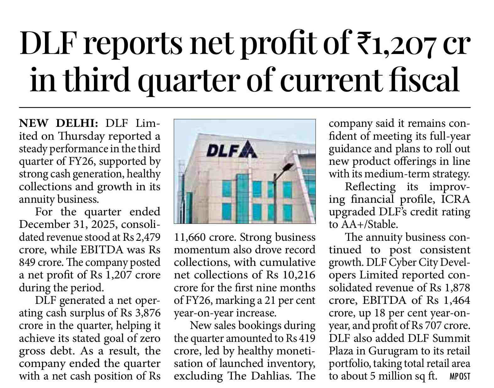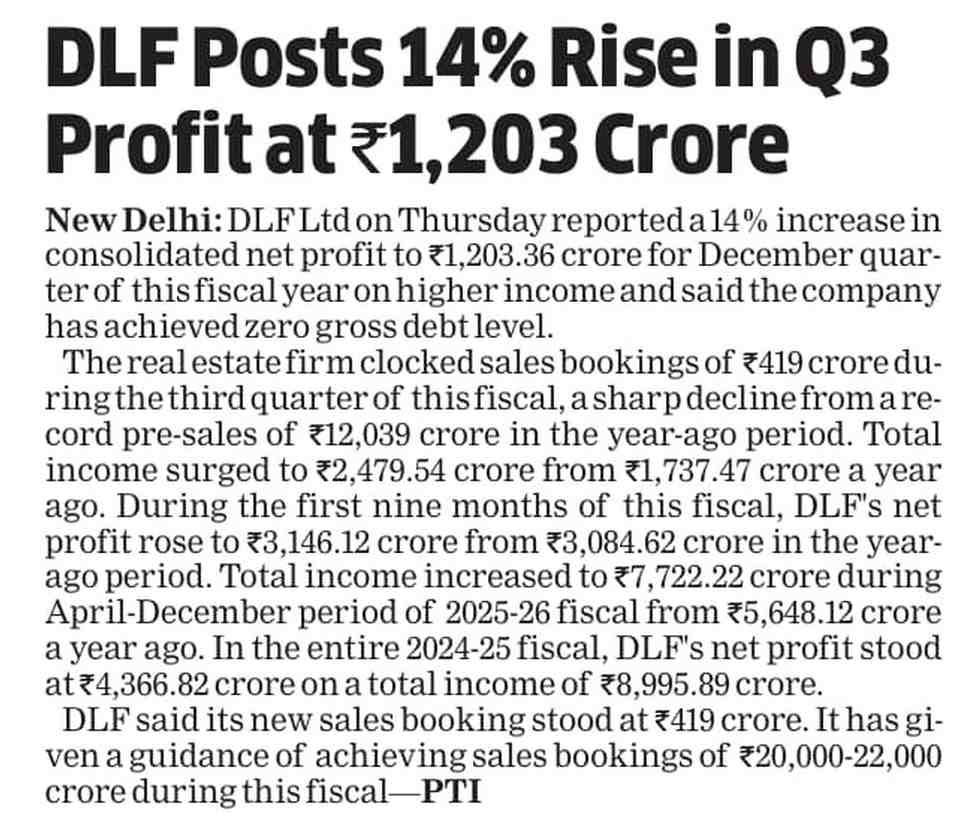 NEW DELHI: DLF Limited on Thursday reported a steady performance in the third quarter of FY26, supported by strong cash generation, healthy collections and growth in its annuity business.