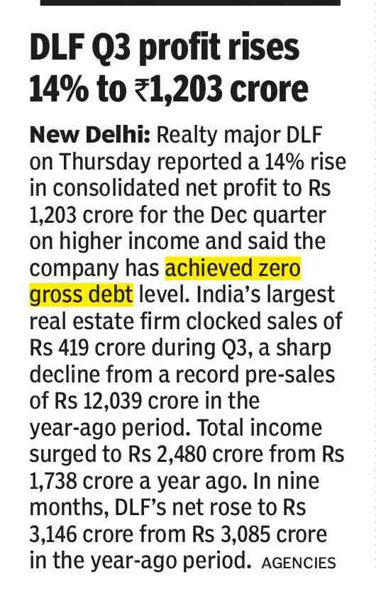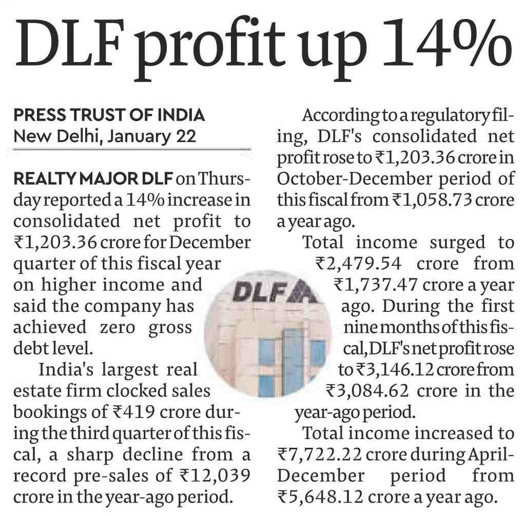 New Delhi: Realty major DLF on Thursday reported a 14% rise in consolidated net profit to Rs 1,203 crore for the Dec quarter on higher income and said the company has achieved zero gross debt level.